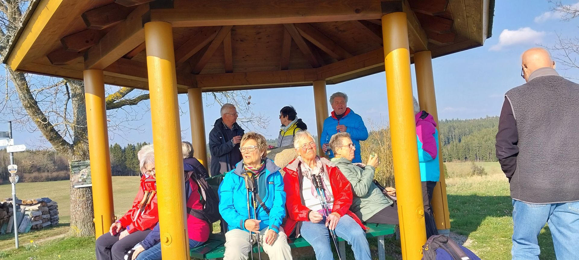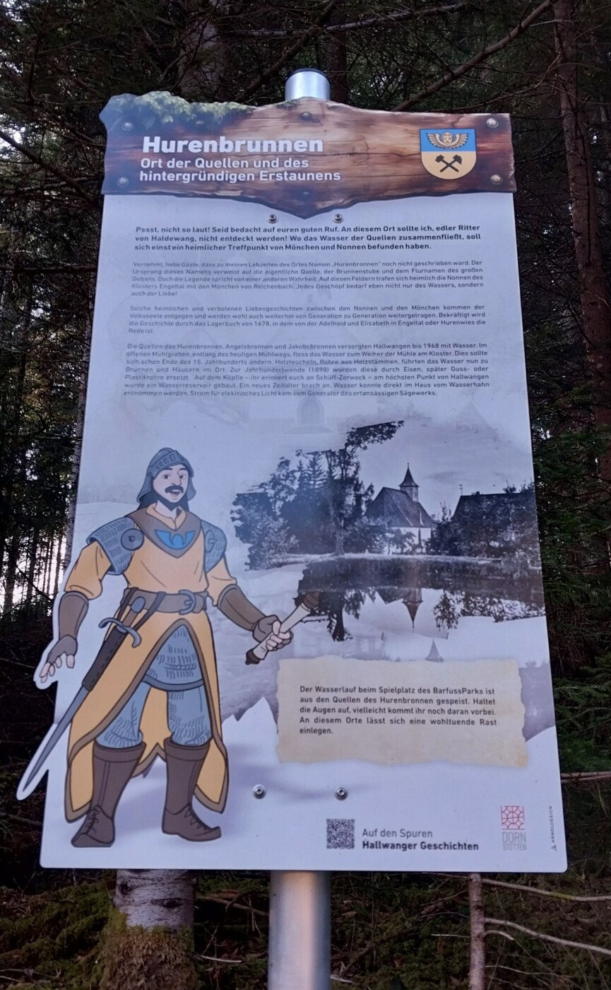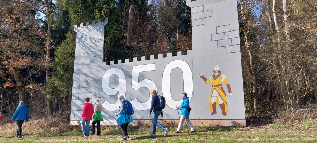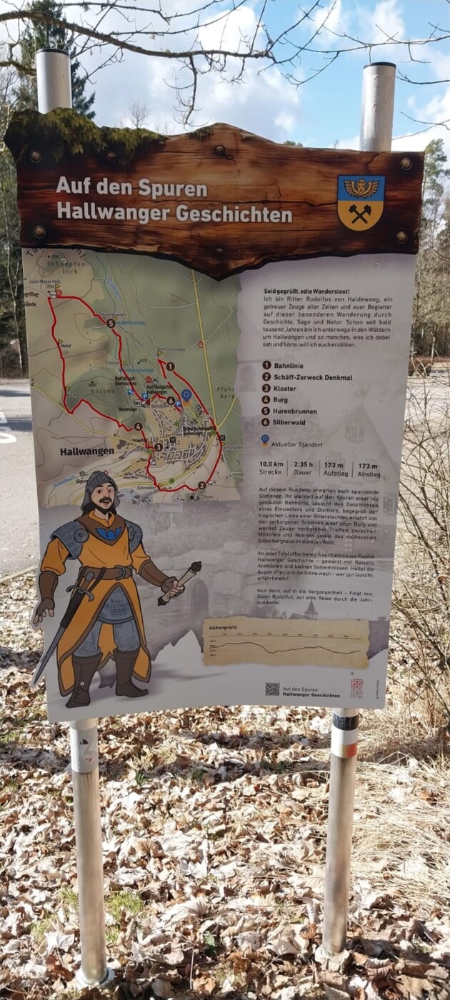 Ritter Rudolfus von Haldewang nimmt uns mit auf die Spuren der Hallwanger Geschichten mit Infotafeln. Gewandert wurde vom Barfusspark zum Köpfle, hinunter über den „alten Stadtberg“ zum Rathaus und hinauf zur Burg Haldewang, Luise-Mayer-Platz und zurück zum Barfusspark. 10 Km, 170 Hm