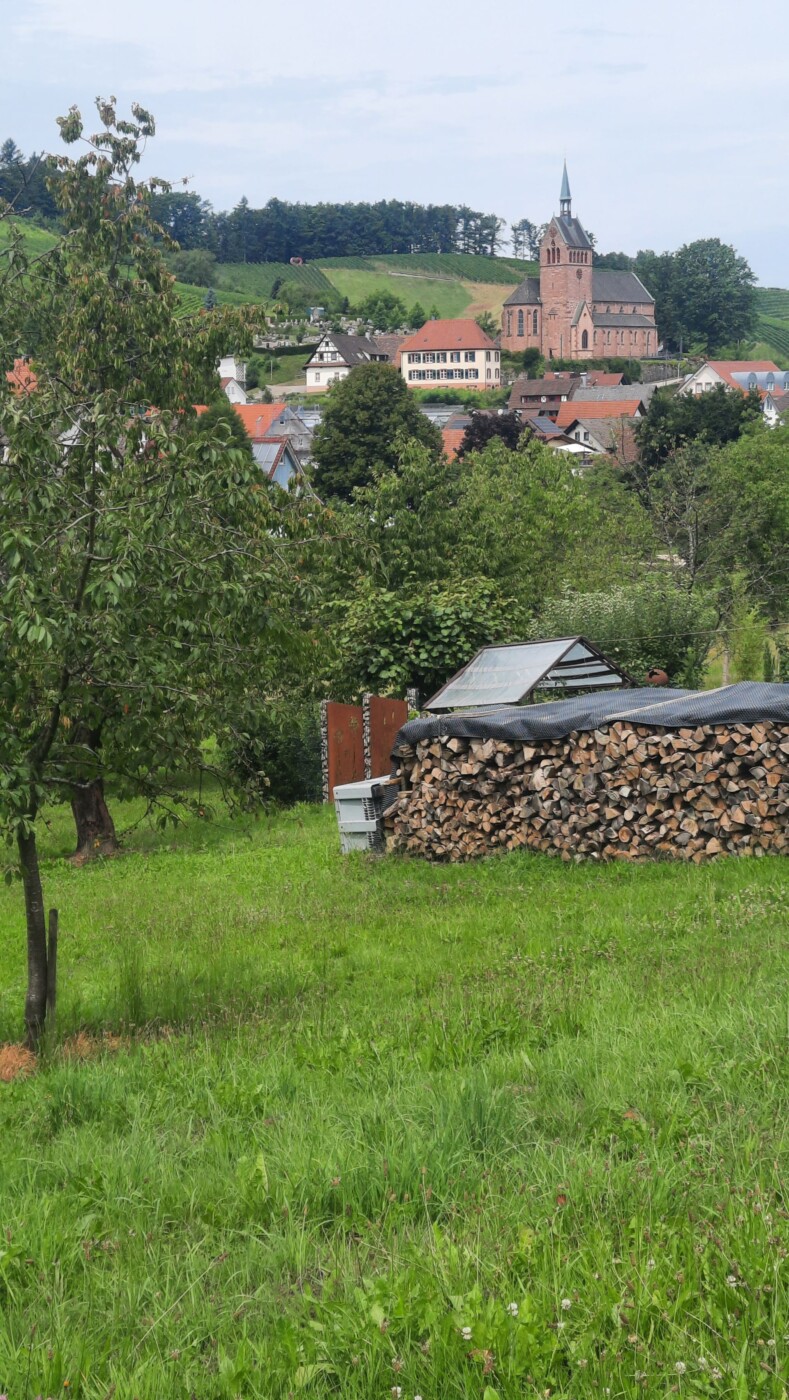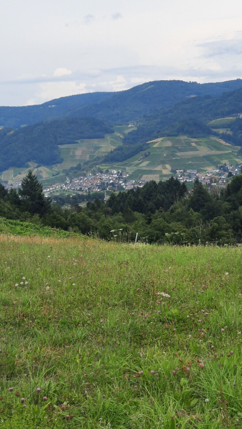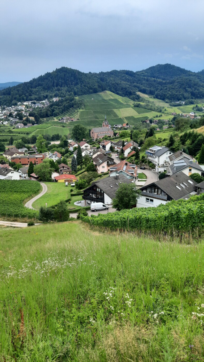 Rathaus Waldulm, Häselhof, Zinselburehof, Rotebene, Fischers Wäldele, Scherd, Pfaffenberg, Rathaus Waldulm. 10 km 310 Hm. Schöne Tour durch die Weinberge mit Ausblicken auf Rheinebene und Hornisgrinde.