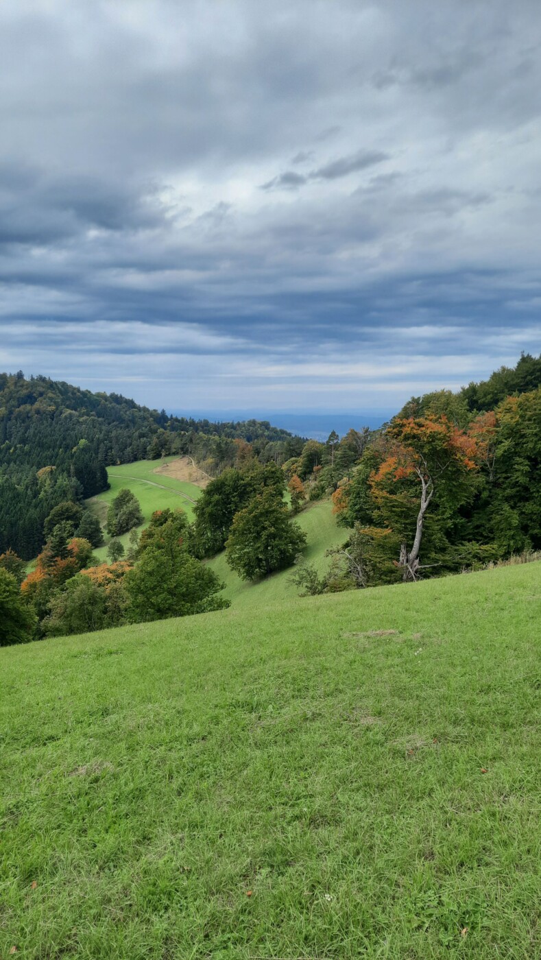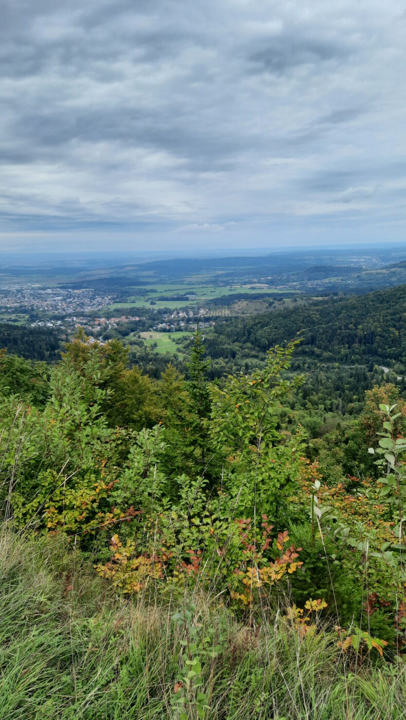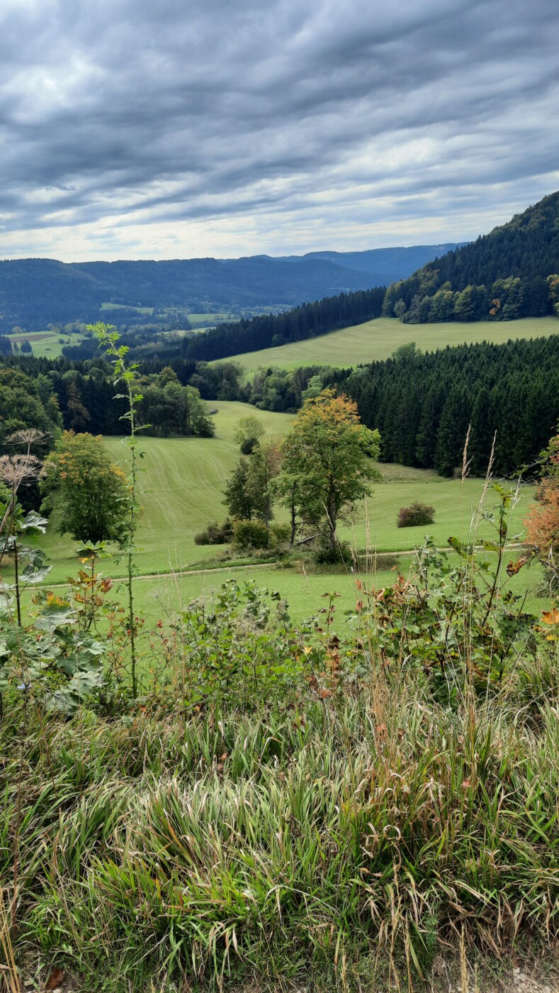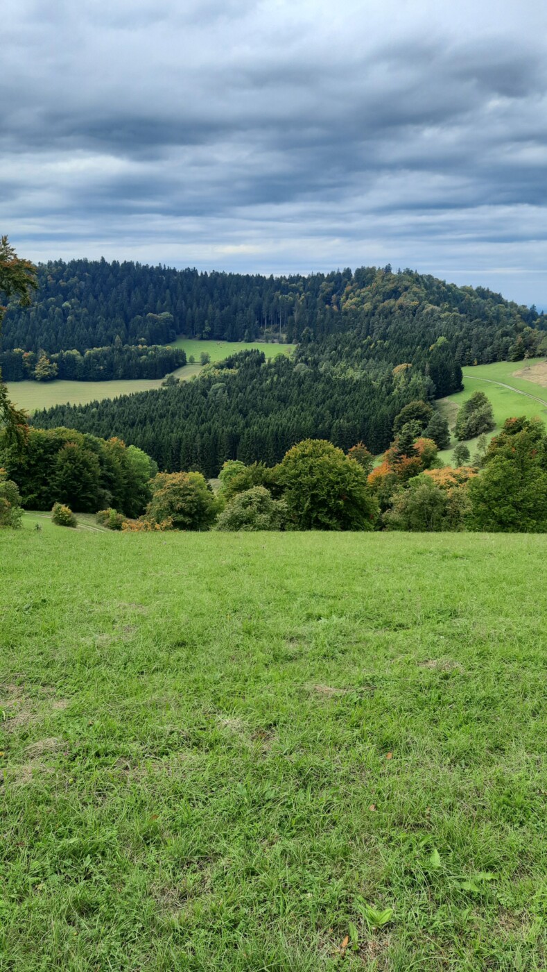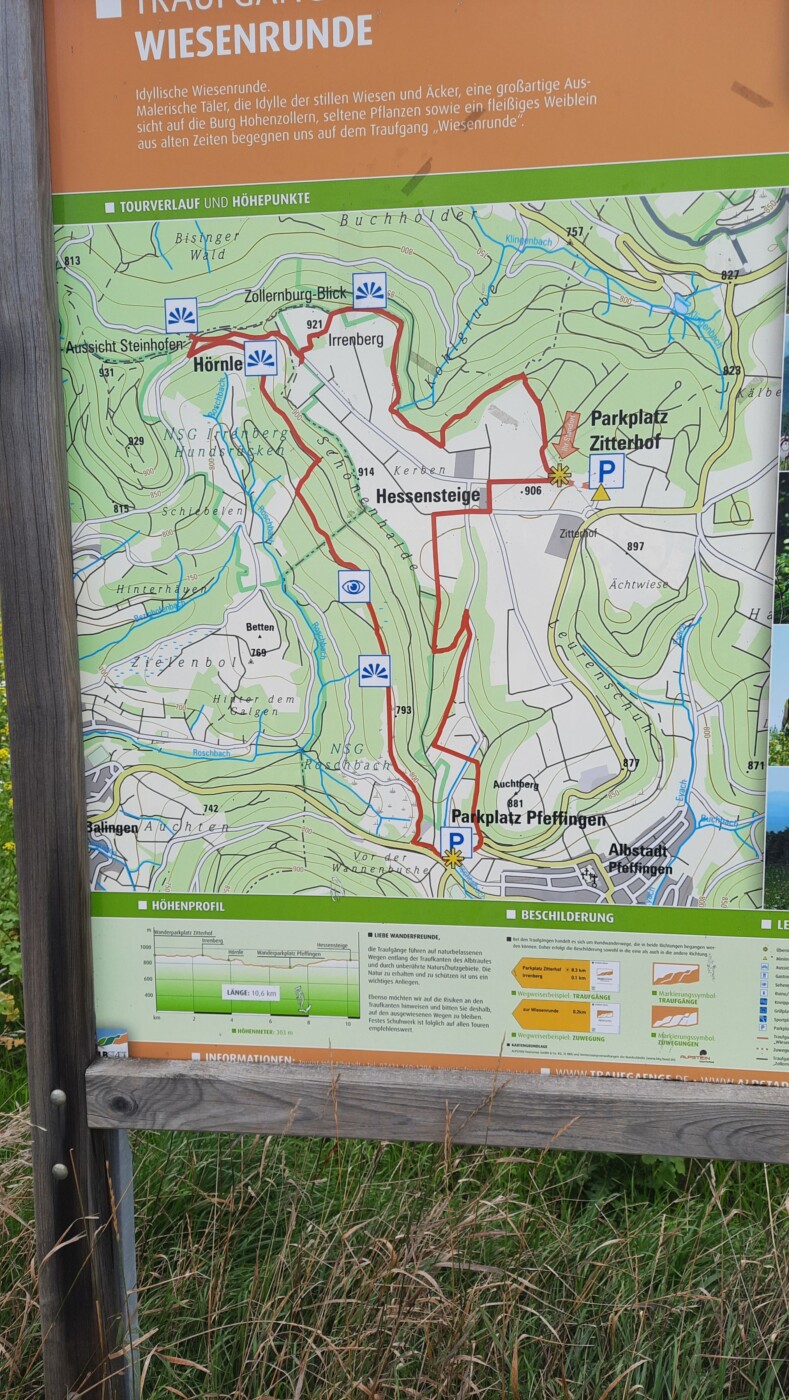 Wanderparkplatz Zitterhof bei Albstadt, Naturschutzgebiet Irrenberg und Roschbach mit schönen Aussichten auf Burg Hohenzollern und Schwäbische Alb. 10 Km, 300 Hm